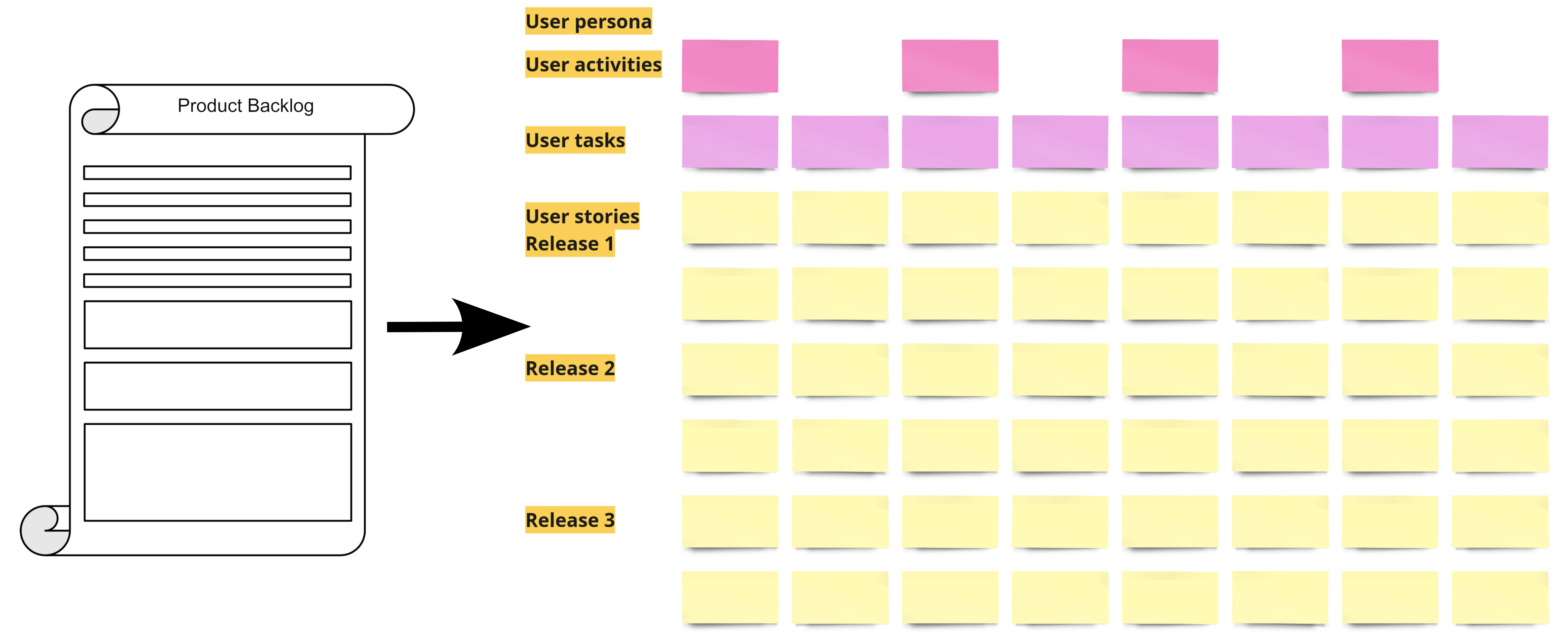 . He came up with the concept as a way to give more structure and cohesion to the idea of a backlog. The traditional agile backlog as it’s been popularized as part of scrum, is to have a list of user stories that is strictly ordered in priority. It is recommended to have the items on top of the backlog to be high in detail but small in scope so they can be implemented by a development team without any more preparation being needed. Items further down the backlog can be less detailed and bigger in scope, and should be broken up and detailed as the time when they might be implemented comes nearer.