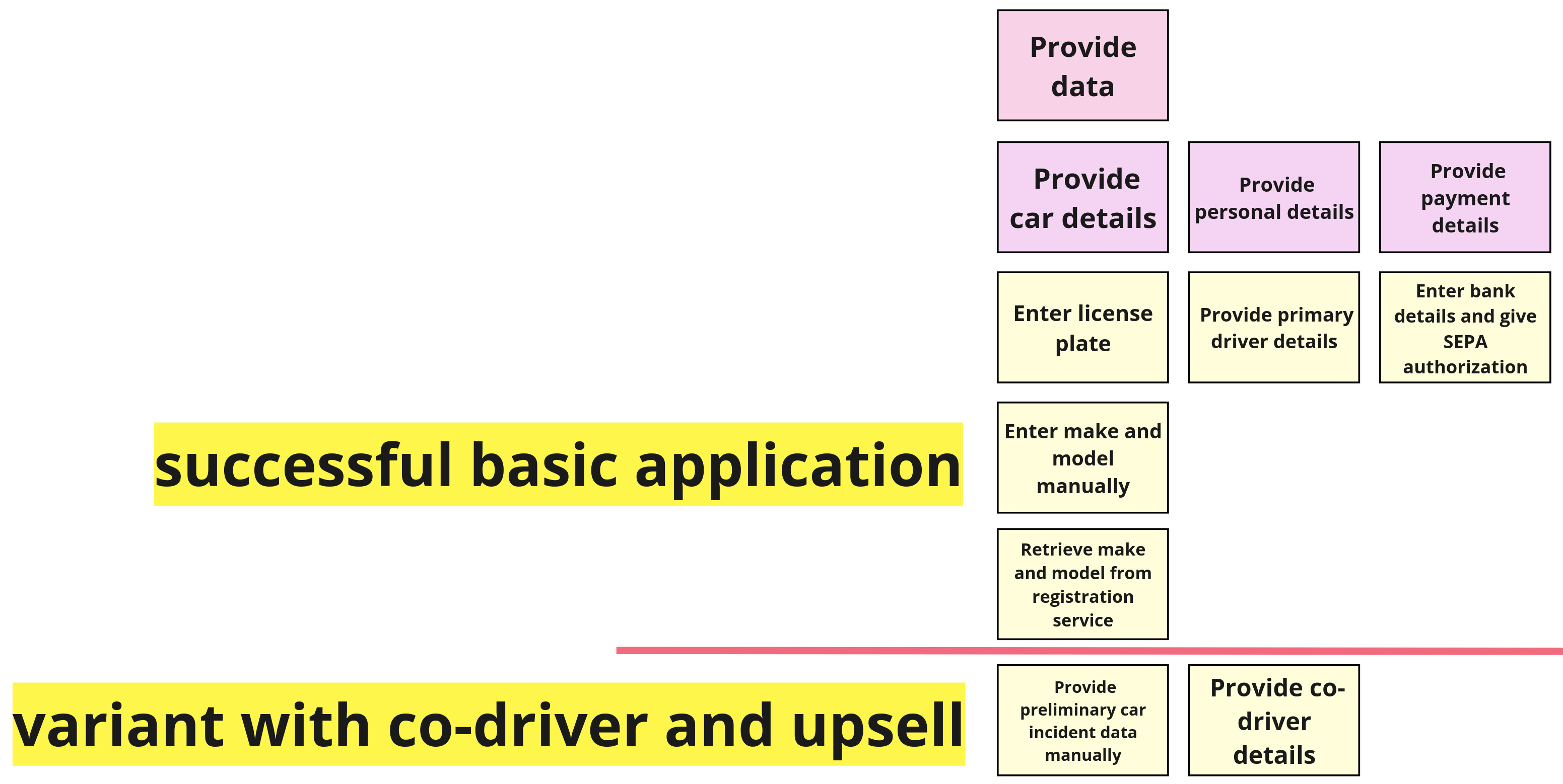 In more complex features, there are often natural clusters of tasks that seem to belong together, but can’t be seen as variations of one step in the journey’s flow. For instance, applying for insurance options in our app can have steps that allow the user to search, filter, view, compare and select an insurance package, while also having steps that request the package, provide personal details, receive an offer (or get declined) and accept the offer. You might group these as separate features, but the user’s journey through the application would go through all of them and if you see them as one journey, the first group could be grouped as an activity “find insurance package”, while the second might be “apply for insurance”.