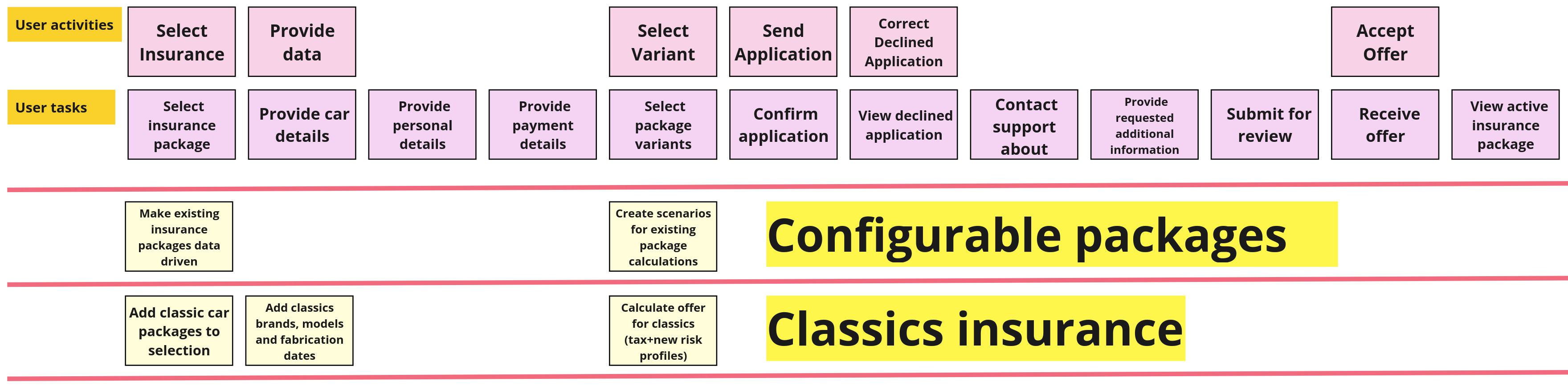 In fact, as you’ve seen, parts of the ‘apply for insurance’ journey goes through a back-office process that judges, automatically or manually, whether an applicant can be accepted for an insurance package. When you first add a feature, it would be quite natural to also include the back-office functionality that will be needed. By placing the functionality as a separate activity, and marking that with the back-office support user as its persona, you can keep the different interests of the different types of users clear and visible.