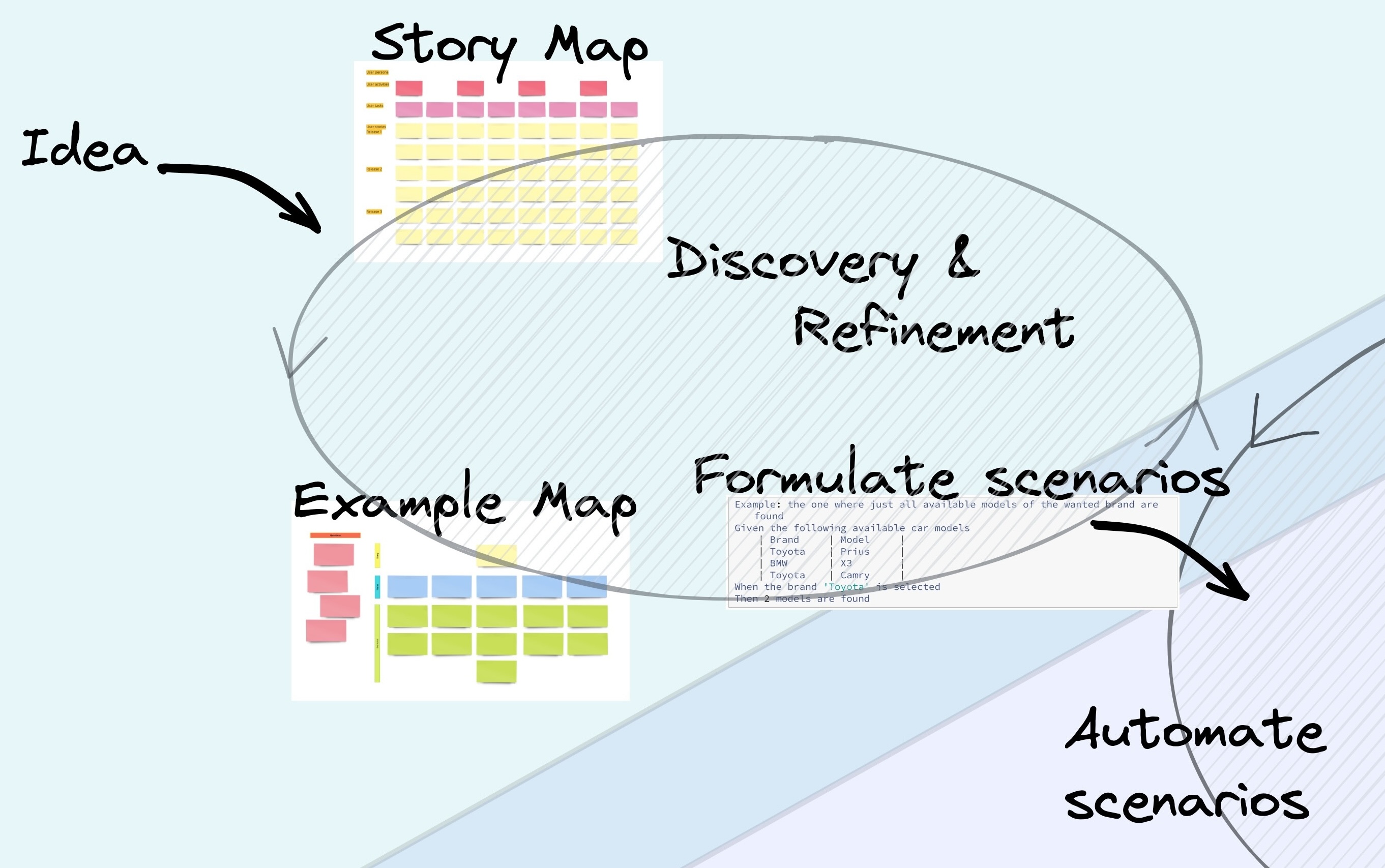 For completeness, a full BDD-style, test-first development process is depicted, but we won’t be going into all the details of that. The main flow, seen enlarged in Figure - “Zoomed in on the discovery part of the process”, is that we start discovery by decomposing a new idea for a feature or product by creating a story map, and then take parts of that map, in the form of stories, and refine those using example mapping and then writing the corresponding scenarios, before using those scenarios as the basis of developing the tests and implementation of the functionality.
