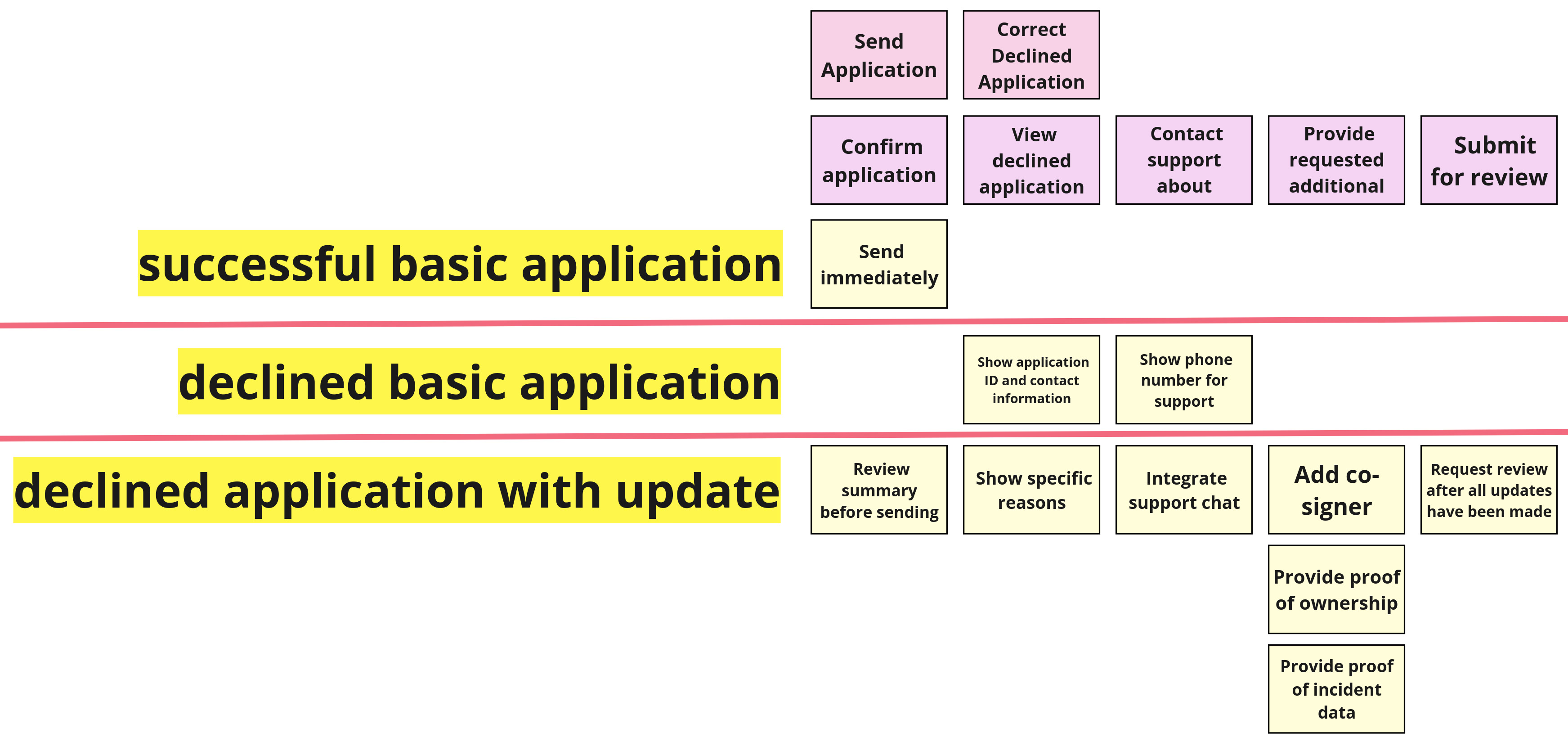While working on that first version of the backbone, you will find that as you go over it with different people new user tasks will be discovered. Sometimes because there’s. a whole different persona, or sometimes, as shown below, because depending on the outcome of a previous step there can be multiple directions the flow can go in.