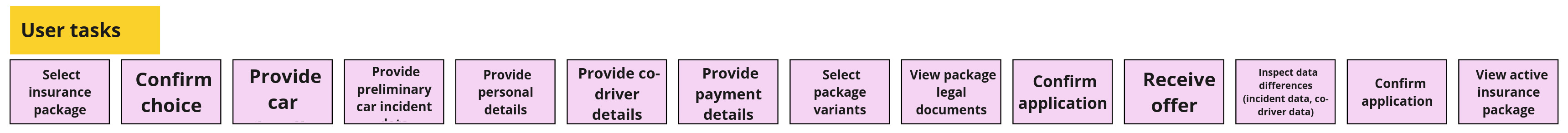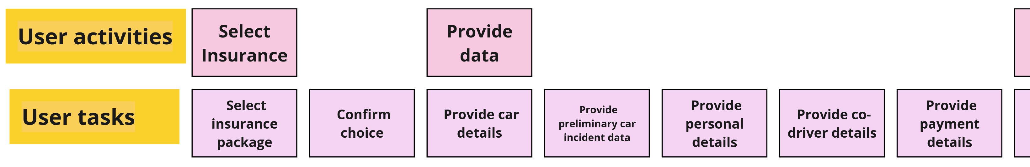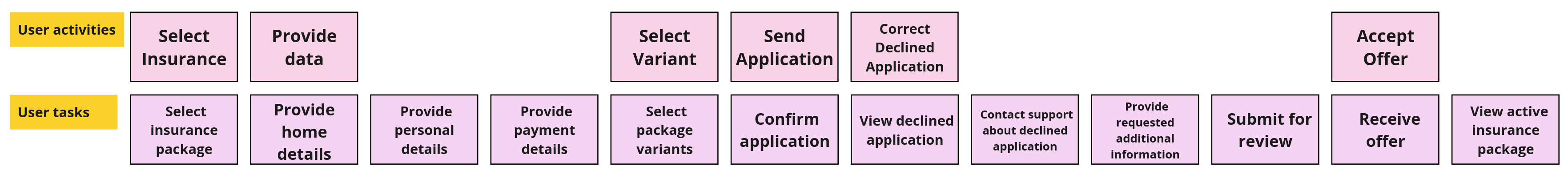 In more complex features, there are often natural clusters of tasks that seem to belong together, but can’t be seen as variations of one step in the journey’s flow. For instance, applying for insurance options in our app can have steps that allow the user to search, filter, view, compare and select an insurance package, while also having steps that request the package, provide personal details, receive an offer (or get declined) and accept the offer. You might group these as separate features, but the user’s journey through the application would go through all of them and if you see them as one journey, the first group could be grouped as an activity “find insurance package”, while the second might be “apply for insurance”.