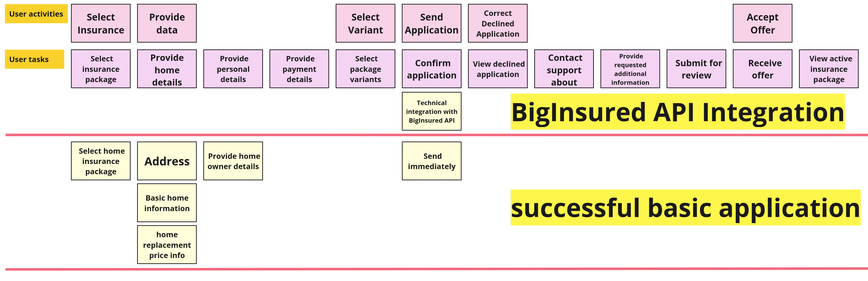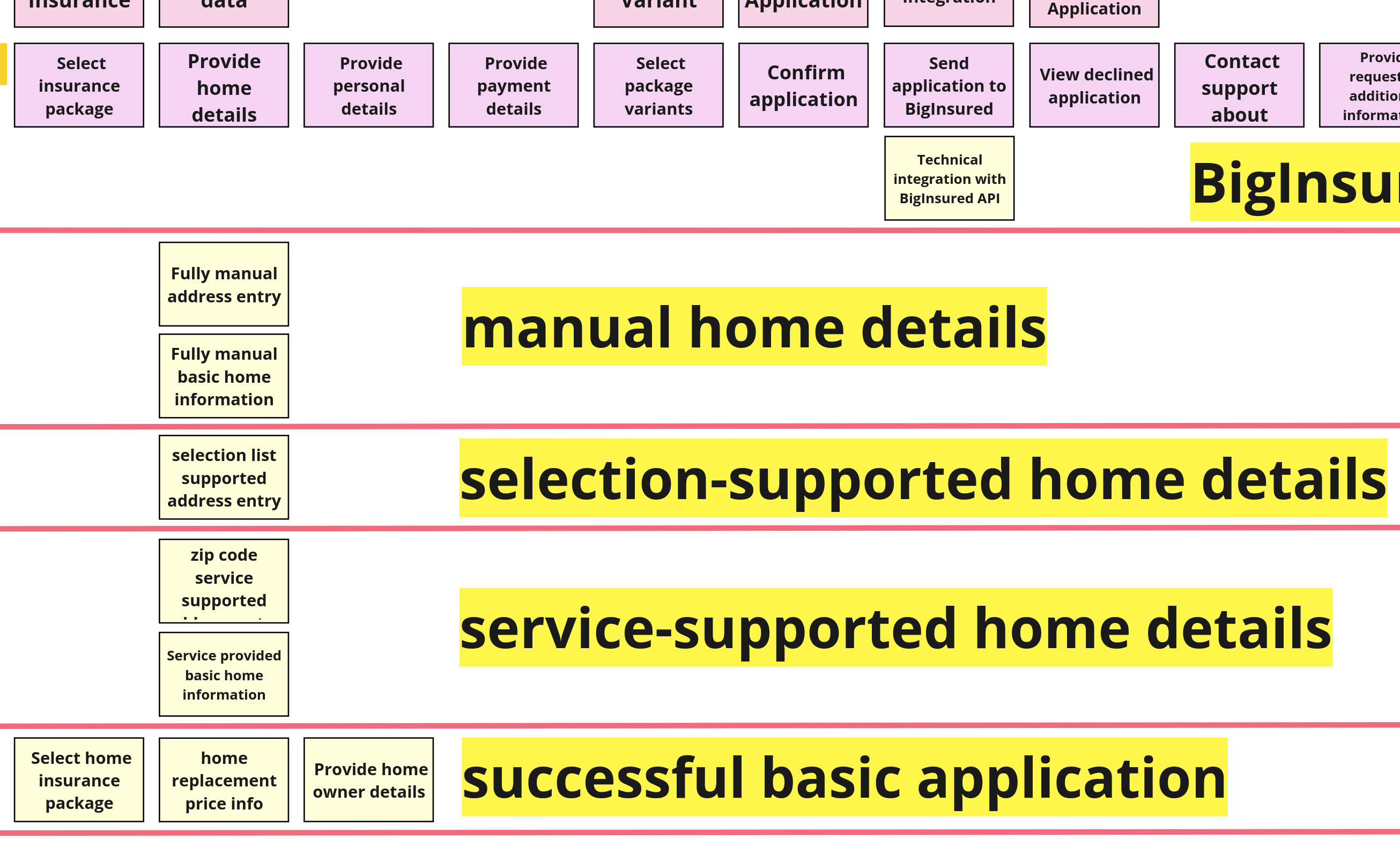 In fact, as you’ve seen, parts of the ‘apply for insurance’ journey goes through a back-office process that judges, automatically or manually, whether an applicant can be accepted for an insurance package. When you first add a feature, it would be quite natural to also include the back-office functionality that will be needed. By placing the functionality as a separate activity, and marking that with the back-office support user as its persona, you can keep the different interests of the different types of users clear and visible.